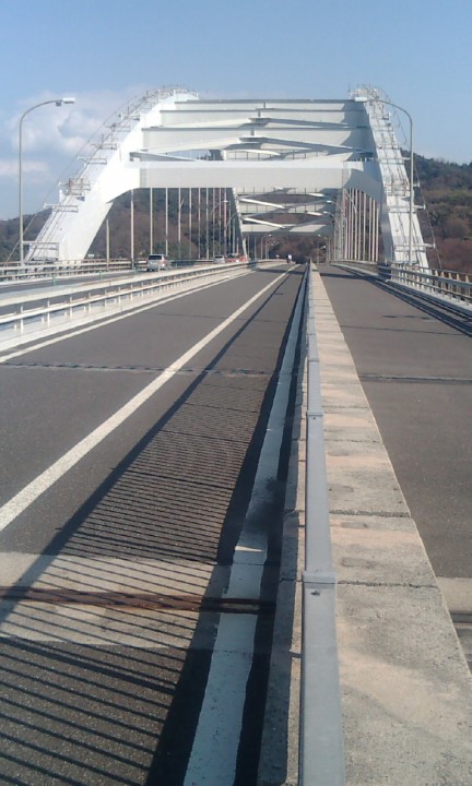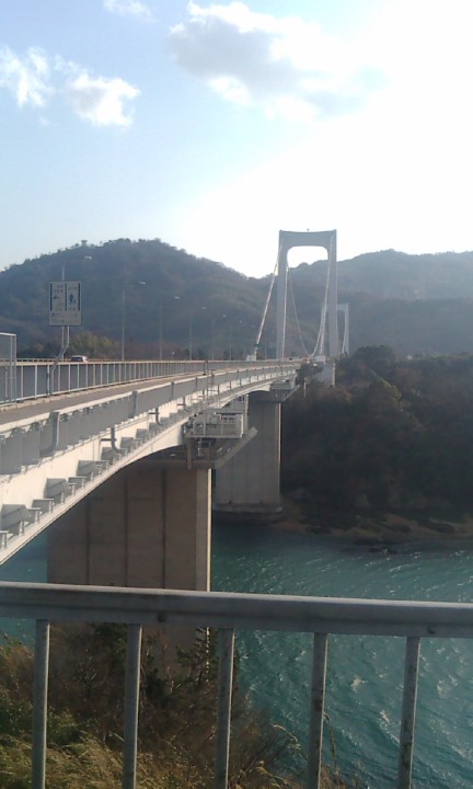 (15:30) ほとんど風景を楽しみこともなく、大三島橋に着いたときには午後の深まりを感じる時間になっていた。 大三島橋はしまなみの橋の中ではかなり短い。本当に助かる。 ただ、それにしても、この大三島橋に上る坂道(舗装路だが山道)は、足を痛めている身にはきつかった。途中、娘から激励の電話が入ってきたが、何とか 頑張ってると伝えるのみ。 |