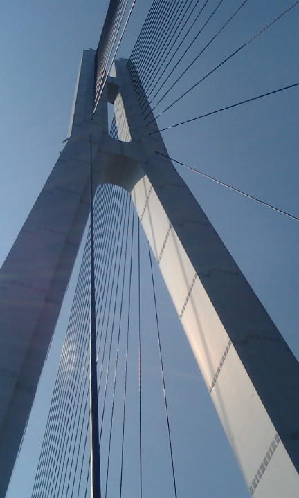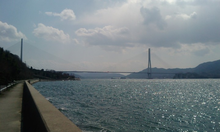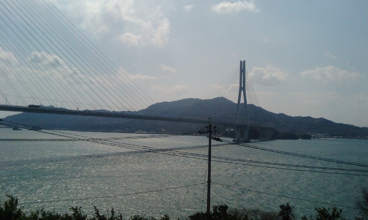| この多々羅大橋は長かった。半端なく長かった。主塔は冗談じゃなくでかく高く、高所恐怖症の私にとっては見上げるだけで足がすくんだ。