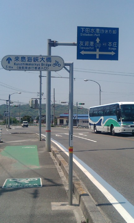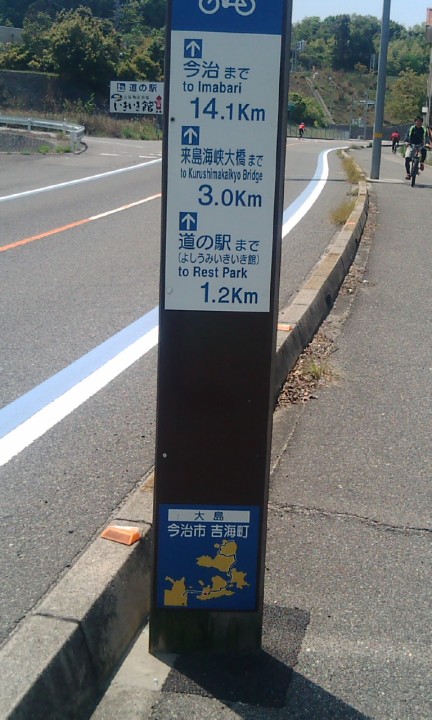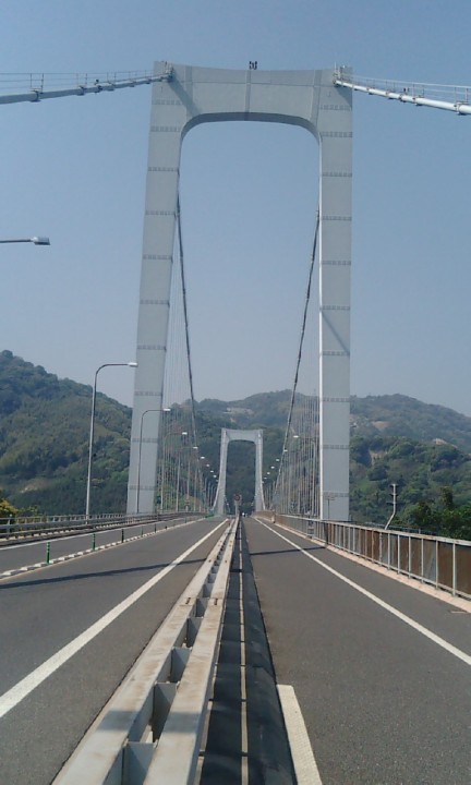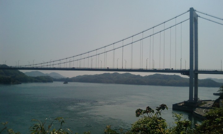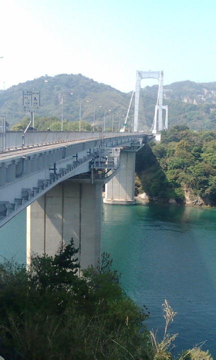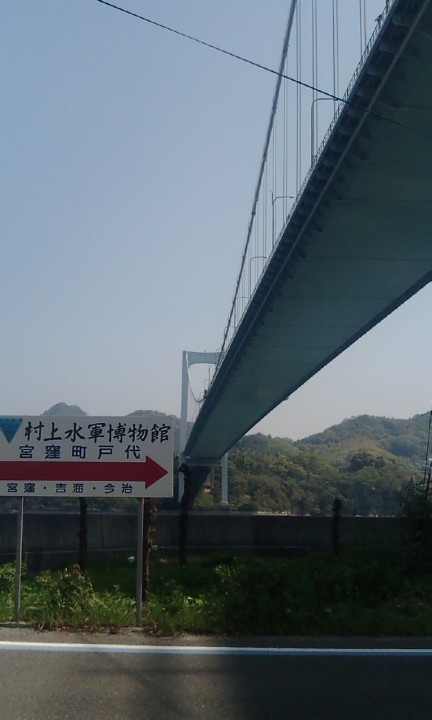 気温が上がってきていたこともあったかもしれない。 程度は微々たるものだが山間部あり平野部ありで、結構アップダウンもあって、足裏を気にしながら、たまに休憩を入れた。それにしても、島を歩きながら 海も見えず、ただただ退屈なウォーキングになった。たまにサイクリストが通りかかる程度で、歩行者はなし。コンビニもなし。多少思考力/食欲も落ちて いたのか、途中にある吉海町の「ライフショップ大島店」に立ち寄ることもせず、ひたすら歩いた。 ところで、この大島を歩いていて目についたのは遍路姿の人々の多さである。集団で回ってられるのだろう、お遍路さんの団体を乗せた大型バスも多い。 『島四国』というのだそうで、この大島の『島四国』は特に著名な島嶼内四国霊場めぐりなのだそうだ。 今日4月28日は旧暦で3月19日。ちょうど遍路市の縁日にあたるそうで、それで白法被姿が多いのだと理解。 日差しがきつくなって多少暑さを感じてきた頃、やっと視界に来島海峡大橋が入ってきた。時刻は12時を過ぎている。 |