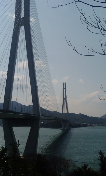 | この多々羅大橋は長かった。半端なく長かった。主塔は冗談じゃなくでかく高く、高所恐怖症の私にとっては見上げるだけで足がすくんだ。