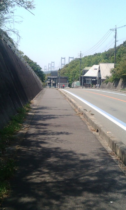 気温が上がってきていたこともあったかもしれない。 程度は微々たるものだが山間部あり平野部ありで、結構アップダウンもあって、足裏を気にしながら、たまに休憩を入れた。それにしても、島を歩きながら 海も見えず、ただただ退屈なウォーキングになった。たまにサイクリストが通りかかる程度で、歩行者はなし。コンビニもなし。多少思考力/食欲も落ちて いたのか、途中にある吉海町の「ライフショップ大島店」に立ち寄ることもせず、ひたすら歩いた。 ところで、この大島を歩いていて目についたのは遍路姿の人々の多さである。集団で回ってられるのだろう、お遍路さんの団体を乗せた大型バスも多い。 『島四国』というのだそうで、この大島の『島四国』は特に著名な島嶼内四国霊場めぐりなのだそうだ。 今日4月28日は旧暦で3月19日。ちょうど遍路市の縁日にあたるそうで、それで白法被姿が多いのだと理解。 日差しがきつくなって多少暑さを感じてきた頃、やっと視界に来島海峡大橋が入ってきた。時刻は12時を過ぎている。 |